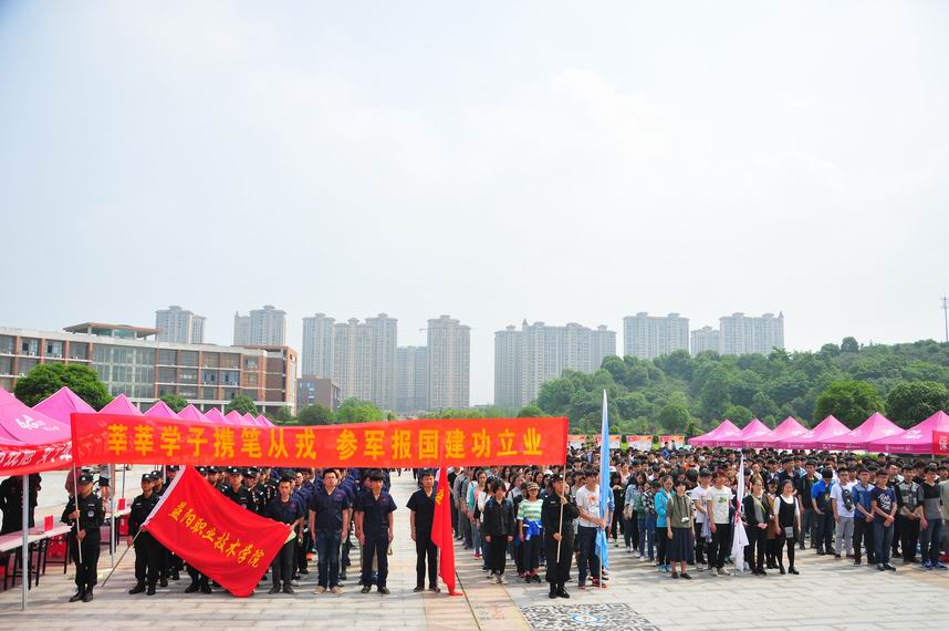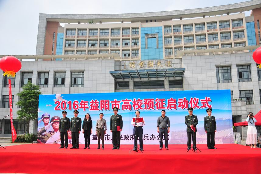 (本网讯)“保卫国家终不悔,绿色军营献青春”,“莘莘学子投笔从戎,参军报国建功立业”。4月27日下午,图书馆前坪广场悬挂满着各式与参军有关的横幅标语。为了让在校大学生了解部队、了解大学生入伍优惠政策,2016年益阳市高校预征启动仪式在我校隆重举行。