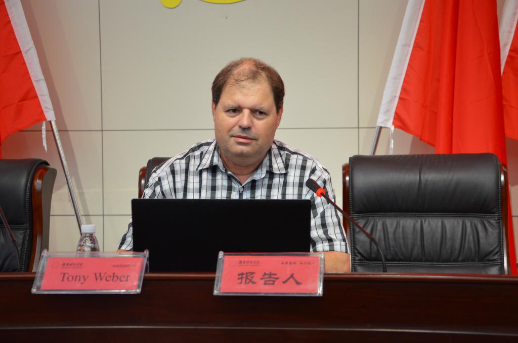 (本网讯)6月30日下午,我校邀请澳大利亚水环境专家Tony Weber来校作“澳大利亚水敏性城市设计及案例对我国海绵城市建设的借鉴”专题学术报告。副校长郑卫民、谭献良,学校产业部门、益阳市规划局、住建局、重点办、南岳区规划局、汉寿县规划局,建筑与城市规划学院、土木工程学院、市政与测绘学院、化学与环境学院师生参加了本次讲座。讲座由郑卫民主持。