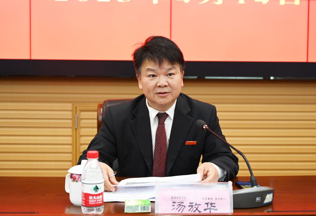 汤放华在动员讲话中就学校开展好学习贯彻习近平新时代中国特色社会主义思想主题教育提出五点意见:一要充分认识开展学习贯彻习近平新时代中国特色社会主义思想主题教育的重要意义。开展这次主题教育,是用习近平新时代中国特色社会主义思想武装全党的迫切需要,是推进新时代党的建设的迫切需要,是保持党同人民群众血肉联系的迫切需要,是实现党的二十大确定的目标任务的迫切需要。二要全面准确贯彻落实主题教育的部署要求。要把握好总要求,落实好根本任务,锚定具体目标,紧紧围绕立德树人的根本任务,将初心使命转化推进学校高质量发展,建设“五个新城院”,办人民满意大学的自觉行动。三要精准聚焦突出的问题。要坚持目标导向和问题导向相统一,着力解决理论学习、政治素质、能力本领、担当作为、工作作风和廉洁自律等6个方面的突出问题,把查找问题、剖析问题、解决问题贯穿主题教育始终。四要着力强化重点措施。要着力抓好理论学习、调查研究、发展首要任务、问题检视和建章立制,有机融合、一体推进,努力取得最好成效。五要切实加强组织领导。要提高思想认识,保持良好作风,明确责任分工,把开展主题教育作为重大政治任务,坚持以加强组织领导为根本保障,进一步压实政治责任,确保主题教育取得扎扎实实成效。