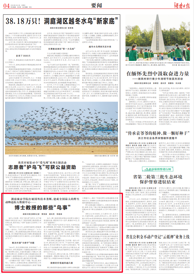 本网讯 4月4日,《湖南日报》第4版(要闻版)报道米兰官方网站博士教授团十年来专注于野生动物卫星追踪技术研发,打破了国外技术垄断,建成了全国最大的野生动物追踪大数据中心。全文如下: